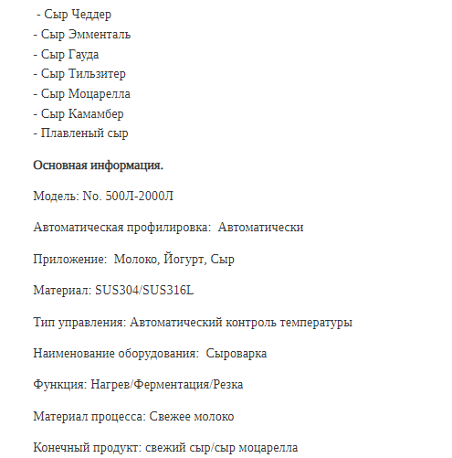 Описание: предназначена для производства мягких и твердых сортов сыра ОСОБЕННОСТИ КОНСТРУКЦИИ: Производительность от 1 тонны/сутки до 50 тонн/сутки Продукция: