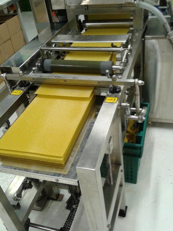 Станок для производства вощины HZGB – это полностью автоматическая машина, предназначенная для точного и быстрого изготовления ленты из пчелиного воска. Автоматическая машина для производства восковых сот HZGB плавит и отфильтровывает пчелиный воск, обеспечивая его очистку. Чистый воск льется из бака через кран на вращающиеся формующие вальцы-матрицы, между которыми растекается по всей ширине, при этом немедленно охлаждаясь. Лента протягивается по ровному столу, после чего нарезается на листы по заданному размеру. Машина оснащена нагревательной камерой или резервуаром, в котором пчелиный воск постепенно плавится с помощью электрических нагревательных элементов или по запросу нагревательной рубашки. Когда воск подвергается процессу фильтрации, из него удаляется мусор, пыльца и остатки пчел, чтобы получился более чистый продукт.