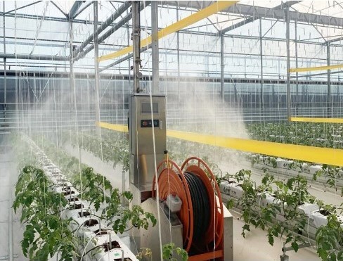 Передвижная наземная оросительная система для теплиц EG представляет собой блок, с помощью которого вода втягивается из резервуара или из крана и равномерно распределяется через разветвление стрелы и разбрызгиватели на поливаемые растения. Это эффективная система полива коммерческих теплиц или больших домашних теплиц, которая не только увлажняет растения, но и устраняет лишние затраты на рабочую силу и часы ручного полива. Мобильная оросительная система для теплиц EG поставлена на опорные колеса и имеет одно рулевое колесо. При этом технологическая тележка имеет колесики, которые можно поставить на дополнительно оборудуемые в теплице рельсы, чтобы движение блока было безошибочно прямым. На раме изделия закреплен насос и есть место для установки заборного бака. Внутри блока есть место для катушки, разматывающей шланг. В нерабочем положении стрелы быстро собираются.