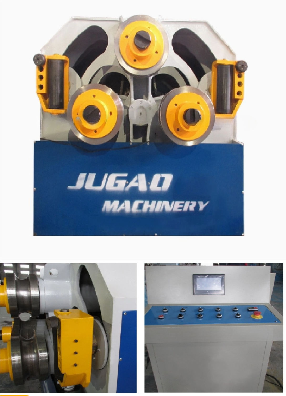 Три валика приводятся в действие. Принцип работы: два нижних валика в качестве основных ведущих валков или все три валика в качестве основных ведущих валков, с фиксированным верхним валком и двумя нижними валками, совершающими движение вверх и вниз вокруг одного фиксированного центра. Тройной редукторный привод, низковольтный драйвер, низкое потребление тока и высокая эффективность. Хорошее гидравлическое управление, жидкокристаллический дисплей смещения с точностью +_0,1 мм. - Двухконтактный стальной стержень может обеспечить хорошее качество отделки гибки асимметричного листового сечения.